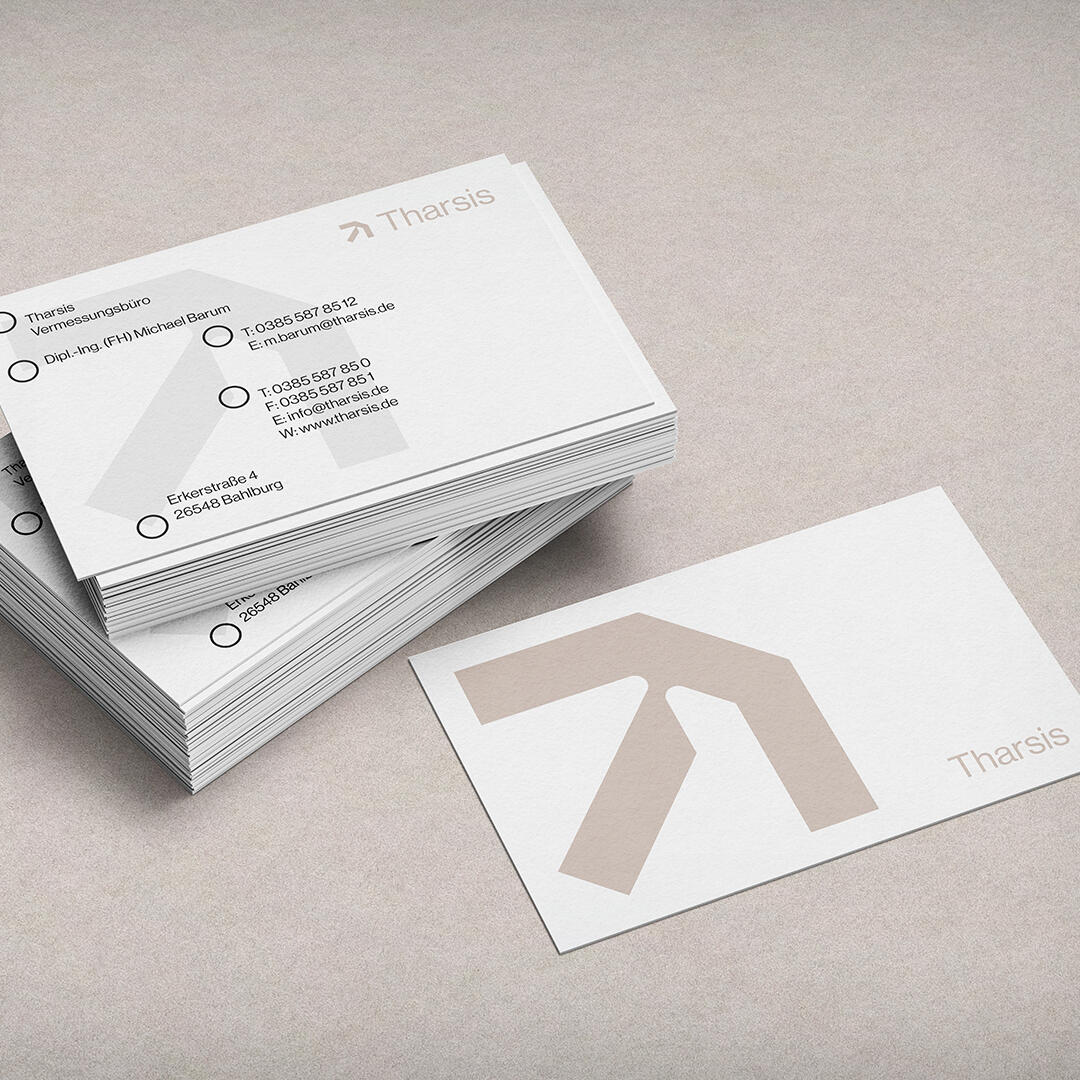 Das Vermessungswesen mag im Kern traditionelle Disziplinen umfassen, doch die heutige Realität ist von Hightech und digitaler Präzision geprägt. Das Team von Tharsis stand vor der Herausforderung, ihre Marke aus der grauen Masse der Mitbewerber herauszulösen. Vor allem fehlte eine visuelle Verankerung, die die Wahrnehmung als zeitgemäßer Dienstleister und dessen Zuverlässigkeit transportierte. Es ging darum, einen glaubwürdigen Rahmen zu schaffen, der potenziellen Kunden die Sicherheit vermittelt: Tharsis ist ein Unternehmen, das die traditionellen Werte des Handwerks ehrt und gleichzeitig die digitale Zukunft aktiv gestaltet.