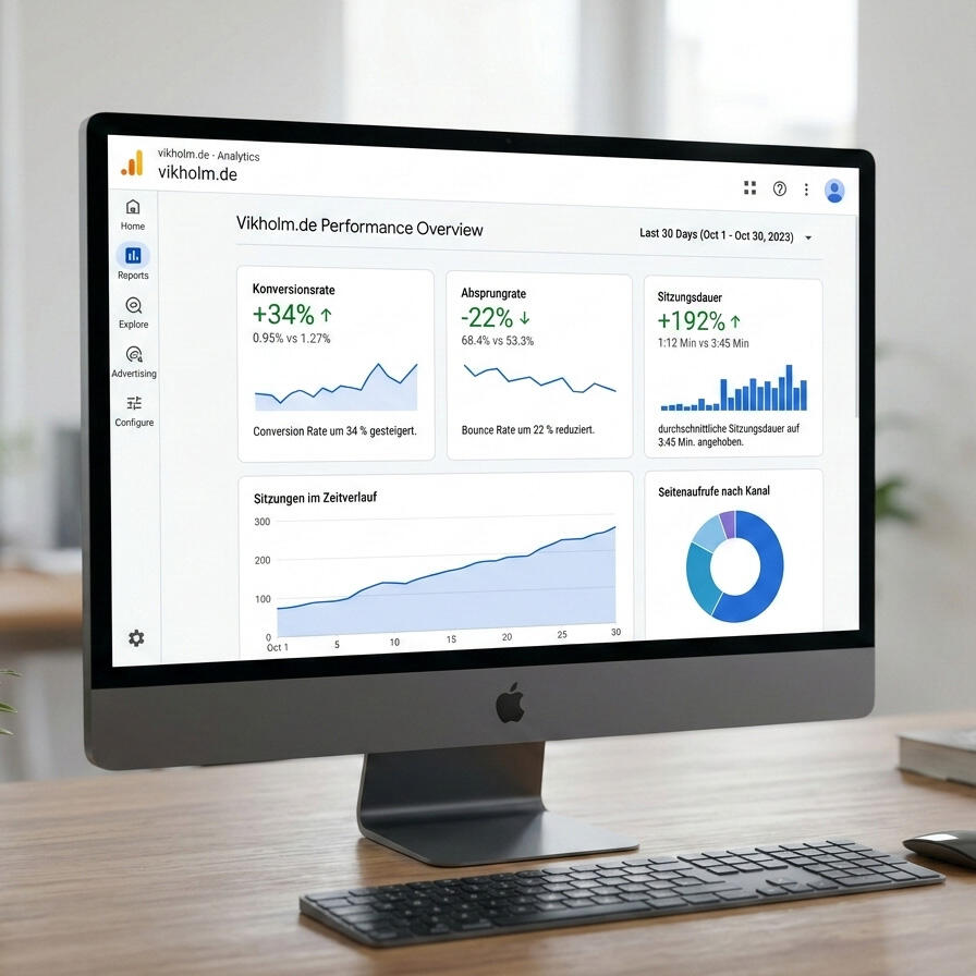 Innerhalb der ersten drei Monate nach Launch stieg die Conversion Rate um 34 %. Dabei reduzierte sich die Bounce Rate um 22 % durch die neue, intuitive Einstiegsführung. Nicht zuletzt konnten wir das User Engagement und die durchschnittliche Sitzungsdauer von 1:12 Min. auf 3:45 Min. anheben, da Nutzer die detaillierten Kursinhalte nun gezielter konsumierten.Lessons Learned: Bei sicherheitskritischen Dienstleistungen ist Design unmittelbar mit Vertrauen gekoppelt. Die Reduktion von Wahlmöglichkeiten (Hicksches Gesetz) durch eine szenariobasierte Führung war der entscheidende Hebel, um die Expertise von vikholm kommerziell zu optimieren.