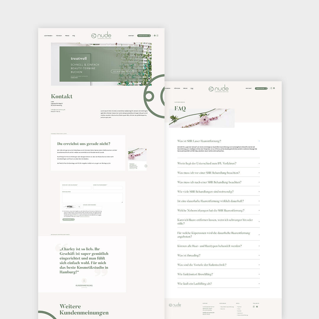 Gerade bei Spezialbehandlungen wie der Laser-Haarentfernung sind Unsicherheit und offene Fragen ein starker Conversion-Killer. Wir haben ein strategisches Knowledge-Gate entwickelt. Durch eine klare, zugängliche Informationsstruktur, die essenzielle Fragen zur Vorbereitung und zum Ablauf direkt auf den Serviceseiten adressiert, konnten wir die Nutzer proaktiv aufklären. Dieses Vertrauens-Element ist bewusst vor dem finalen Buchungsschritt platziert, was das Studio bei telefonischen Rückfragen entlastete.Für uns ist dies der Kern von gutem, nachhaltigem Design: Wir antizipieren die Sorgen des Nutzers und die Herausforderungen des Business-Workflows gleichermaßen, um eine Lösung zu schaffen, die in der täglichen Praxis reibungslos funktioniert und Vertrauen aufbaut.